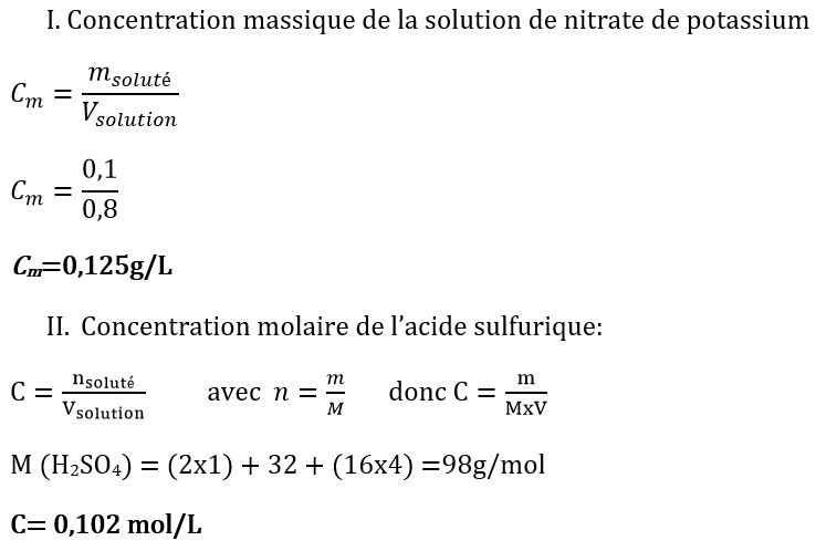 I- On dissout 100 mg de nitrate de potassium KNO3 dans 0,800 L d’eau. Quelle est la concentration massique de cette solution?