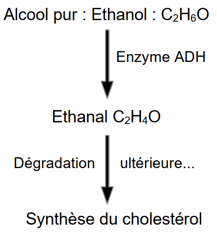 On trouve dans un document publié par l'Institut suisse de prévention de l'alcoolisme (ISPA) les informations suivantes : Quand une personne consomme de l'alcool, celui-ci commence immédiatement à passer dans le sang. Plus le passage de l'alcool dans le sang est rapide, plus le taux d'alcool dans le sang augmentera rapidement, et plus vite on sera ivre. L'alcool est éliminé en majeure partie par le foie. Dans le foie, l'alcool est éliminé en deux étapes grâce à des enzymes. Dans un premier temps, l'alcool est transformé en éthanal par l'enzyme alcool déshydrogénase (ADH). L'éthanal est une substance très toxique, qui provoque des dégâts dans l'ensemble de l'organisme. Il attaque les membranes cellulaires et cause des dommages indirects en inhibant le système des enzymes. Dans un deuxième temps, l'éthanal est métabolisé par l'enzyme acétaldéhyde déshydrogénase (ALDH).