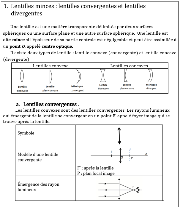 I. Caractéristiques d’une lentille mince convergente et divergente