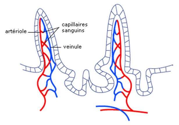 Au niveau de l'intestin grêle, les artères et les veines sont nombreuses. De même, il existe un vaste réseau de capillaires dans la paroi intestinale. Ces capillaires irriguent la très fine paroi des villosités séparant le sang du contenu intestinal. [1]