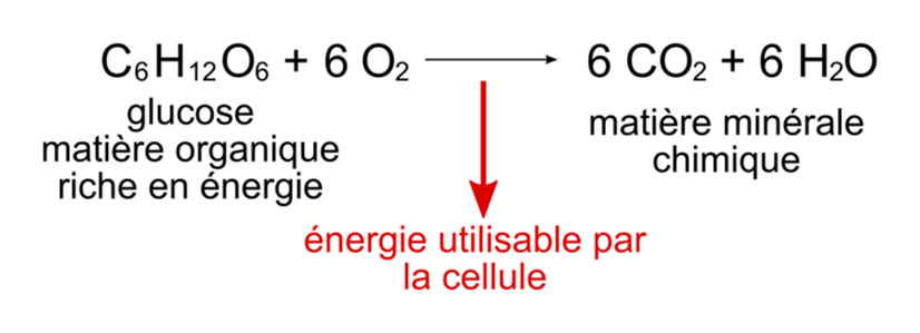 Un exemple de métabolisme cellulaire est la respiration cellulaire au cours de laquelle, la cellule utilise de la matière organique (glucose) et de l’Oxygène pour avoir de l’énergie. Cette respiration s’accompagne d’une libération de gaz carbonique et de l’eau. Elle a lieu au niveau de la mitochondrie.[2]