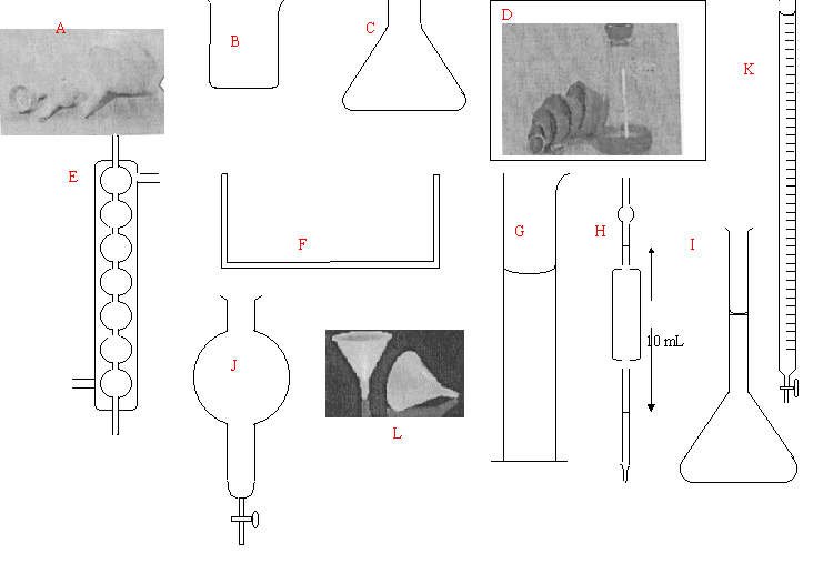 A : entonnoir de bûchner ; B : bécher ; C :erlenmeyer ; D : fiole à vide ; E : réfrigérant ; F : cristallisoir ; G : éprouvette graduée ; H :pipette jaugée ; I : fiole jaugée ; J : ampoule à décanter ; K : burette. L : entonnoir.