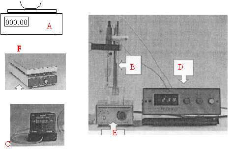 A : balance ; B ; sonde du pHmètre ; C : capteur de pression ; D : pHmètre ; E : agitateur magnétique ; F : plaque chauffante ;.