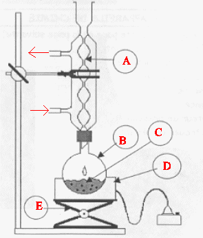 A : réfrigérant à boulles ; B : ballon ; C : pierre ponce ; D : chauffe ballon ; E : support élévateur