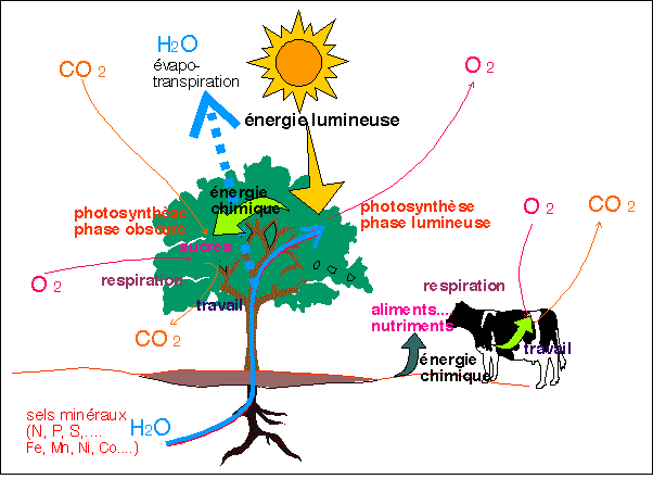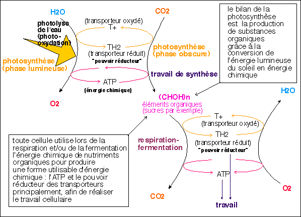 Toutes les cellules d'une plante chlorophyllienne utilisent ensuite cette énergie chimique contenue dans les glucides synthétisés pour réaliser tous les travaux cellulaires (synthèses, croissance...). L'utilisation de l'énergie chimique passe par la respiration ou la fermentation (pour une définition de ces termes voir cours sur la respiration de l'homme).