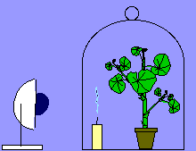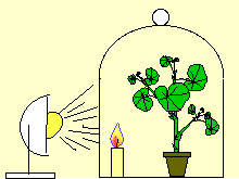 Dans la cloche hermétique, la bougie continue à se consumer si la plante verte est éclairée. |
