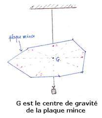 Expérience : une plaque mince est suspendue par un fil. On trace sur la plaque, quand elle s’immobilise, une droite dans le prolongement du fil. On recommence en suspendant la plaque par d’autres points.