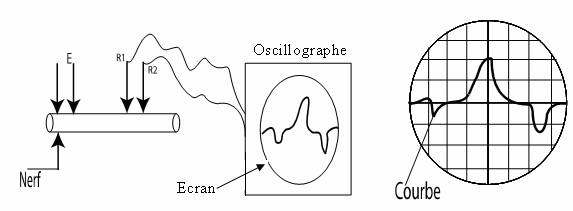 On réalise le montage expérimental ci-dessous et on excite au point E le nerf, on obtient la courbe ci-après.