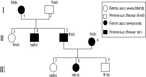 On se propose d’étudier la transmission de quelques facteurs héréditaires dans le couple suivant. L’union d’une femme aux cheveux noirs et frisés et d’un homme aux cheveux blonds et frisés a donné la descendance présentée par l’arbre généalogique suivant :