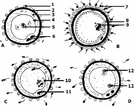 B/ Les dessins A, B, C et D ci-après montrent quelques phases de la fécondation « in vitro » chez un Mammifère.