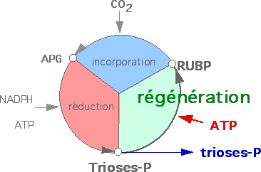 Le fondement même du cycle de Calvin est de permettre la régénération du RUBP à partir d'une fraction des trioses formés. C'est la condition nécessaire qui permettra à nouveau de réaliser l'incorporation de nouvelles molécules de CO2. |