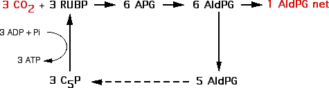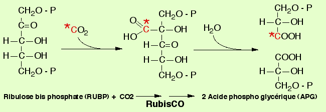 La RubisCO incorpore une molécule de CO2dans un corps en C5, le Ribulose bis phosphate (RUBP) pour donner deux molécules d'un composé en C3, l'acide phosphoglycérique (APG), après passage par intermédiaire réactionnel à C6.