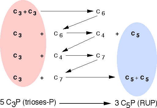On peut schématiser le processus de régénération du RuBP en considérant la fixation de 3 molécules de CO2 qui conduisent à la formation de 6 trioses. Sur les 6 trioses formés, 1 triose servira à la synthèse ultérieure des sucres plus complexes, les 5 autres trioses servant à régénérer 3 molécules de RUBP,