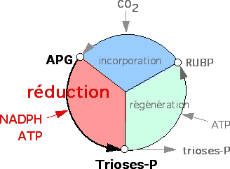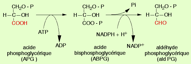 L'APG, le premier composé formé par l'incorporation du CO2, n'est pas un sucre. Les sucres sont des substances carbonées réduites qui comportent une fonction aldéhyde ou cétone. Une étape importante consiste donc en la réduction de l'APG. |