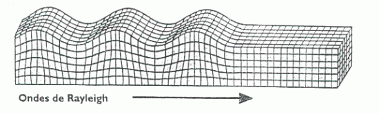 L'onde de Rayleigh, son déplacement est complexe, c'est un mouvement elliptique à la fois horizontal et vertical, rétrograde à faible profondeur R et pro grade pour une profondeur supérieure au cinquième de la longueur d'onde H. Les vibrations engendrées par cette onde durent plusieurs minutes. Elle résulte d’interférences entre les ondes P et S verticales.