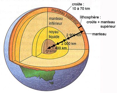 La Terre se compose de trois couches principales de roche. Le manteau est une couche très épaisse formée de roche en fusion appelée magma. La couche supérieure du manteau se refroidit, par échange d'énergie, au contact de la croûte solide plus froide. Pendant ce temps, la couche inférieure du manteau se réchauffe en échangeant de l'énergie avec le noyau très chaud. Ces transferts d'énergie créent des courants de convection (fluide chaud moins dense qu'un fluide froid).