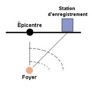 Le lieu de rupture de la faille est appelé foyer du séisme, les ondes sismiques libérées lors de la rupture se propagent en cercles qui ont pour origine le foyer. A la surface, le point atteint en premier par les ondes se trouve donc à la verticale du foyer et est appelé épicentre. C'est donc ici que généralement l'intensité du séisme est la plus forte. Les ondes sismiques sont des ondes élastiques, elles peuvent traverser un milieu sans modifier durablement ce milieu.
