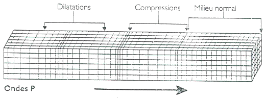 Les ondes P ou ondes primaires appelées aussi ondes de compression ou ondes longitudinales. Le déplacement du sol qui accompagne leur passage se fait par dilatation et compression successives, parallèlement à la direction de propagation de l'onde. Elles sont responsables du grondement sourd que l'on peut entendre au début d'un tremblement de terre et se propagent dans les solides, les liquides et les gaz.