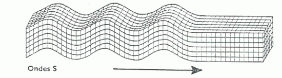 Les ondes S ou ondes secondaires appelées aussi ondes de cisaillement ou ondes transversales. Ces ondes ne se propagent pas dans les milieux liquides (elles sont arrêtées par le noyau de la Terre). L'onde S se propage en cisaillant les roches latéralement, à angle droit par rapport à sa direction de propagation.