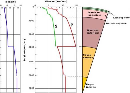 La vitesse de propagation des ondes de volume (ondes P et S) augmente avec la profondeur, du fait que la densité du sol est de plus en plus importante au fur et à mesure que l'on se rapproche du noyau. Les ondes S se propageant uniquement dans les solides, leur propagation s'interrompt à la limite du noyau. La vitesse des ondes P chute brutalement au contact du noyau externe car cela correspond à un changement d'état de la matière (manteau inférieur: solide/noyau externe: liquide). Étant donné que la pression augmente lorsque l'on se rapproche du centre de la terre, la matière constituant le noyau se solidifie, c'est pour cela que la vitesse des ondes P augmente légèrement à l'approche du noyau interne.