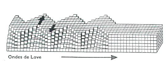 L'onde de Love, elle déplace le sol d'un côté à l'autre dans un plan horizontal perpendiculairement à sa direction de propagation. Le déplacement est essentiellement le même que celui des ondes S sans mouvement vertical. Elle résulte d’interférences entre ondes P et S horizontales. Les ondes de Love provoquent un ébranlement horizontal qui est la cause de nombreux dégâts aux fondations des édifices.