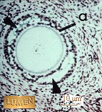 Jeune follicule cavitaire. Les deux flèches indiquent les cavités qui apparaissent entre les cellules folliculaires. |