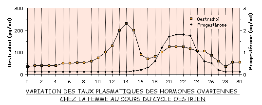 Chez la femme, les variations moyennes de sécrétion des oestrogènes (oestradiol) et des progestagènes (progestérone) se présentent ainsi: