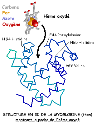 La myoglobine est une protéine, présente chez tous les Vertébrés, dont la fonction est de fixer le gaz dioxygène dans le muscle. Une étude de la molécule avec un logiciel en 3D (Rasmol) révèle la relation entre structure et fonction: la chaîne polypeptidique forme, en un endroit, une "poche" dans laquelle un groupement non protéique appelé "hème" comporte un atome de fer capable de fixer 2 atomes d'oxygène.