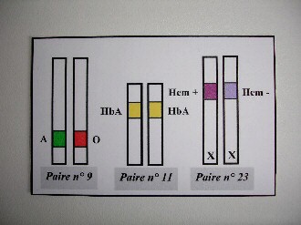 - la paire n° 9 avec les allèles des groupes sanguins : A et B = allèles dominants, O = allèle récessif,