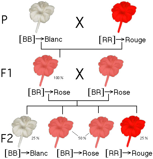 Si l'on croise deux de ces fleurs roses F1, à la seconde génération "F2", on obtiendra des plantes à fleurs rouges, d'autres à fleurs blanches et d'autres à fleurs roses.