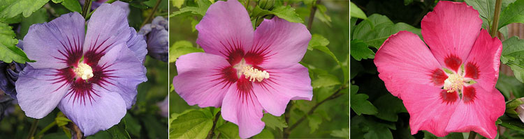 Ketmies de Syrie Hibiscus syriacus, Malvaceae,Malvales, Magnoliopsides (=Dicotylédones): à gauche, la variété 'Blue Bird', à droite la variété 'Woddbridge' et au centre l'hybride obtenu, de couleur intermédiaire entre les parents et qui associe donc les caractères parentaux. (Jardin à Hamois, Belgique - 11/08/2005 - Photographies originales réalisées par Eric Walravens).