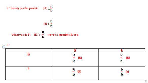 b- Rouge apparu en F1 donc dominant représenté par R et blanche masqué en F1 donc récessif représenté par b