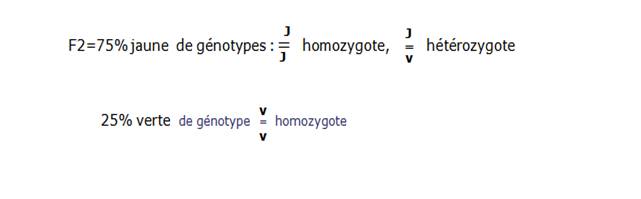 -La première loi de Mendel, ou loi d'association ou loi de l’uniformité de F1, dit que "les hybrides issus du croisement de parents de lignée pure différant par un caractère sont uniformes et associent les caractères parentaux", ici les couleurs jaune et verte ; dans notre exemple F1 100% jaune