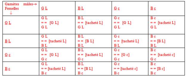 Gamètes de F1 : G L (25 %), B L (25%), G c (25%), B c (25%)