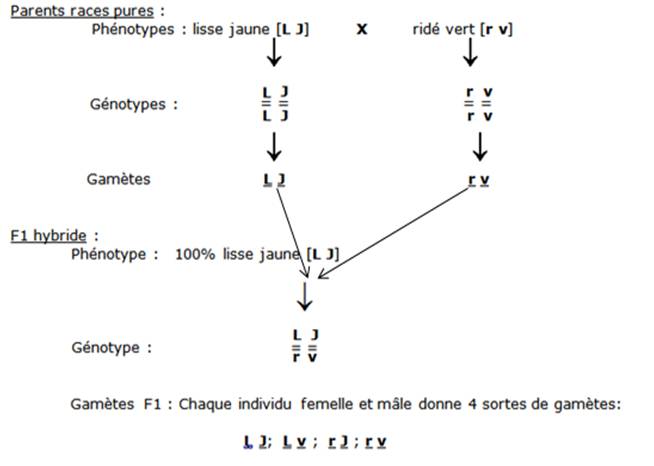Mendel croise deux races pures de pois qui diffèrent par deux caractères, soit 2 gènes ou 2 couples d’allèles : il croise des pois à cotylédon lisse de couleur jaune avec des pois à cotylédon ridé de couleur verte.