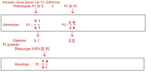 1° Préciser les génotypes des parents et de la F1