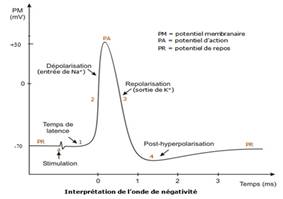 L’onde de négativité ou potentiel d’action peut se présenter sous plusieurs formes suivant les dispositions des microélectrodes réceptrices : Onde monophasique avec une seule pointe ou onde diphasique ou biphasique avec deux pointes