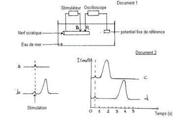 3- En utilisant les données des courbes c et d du document 2 et celles du tableau précédent, calculer la vitesse de conduction du nerf sciatique d’une grenouille.