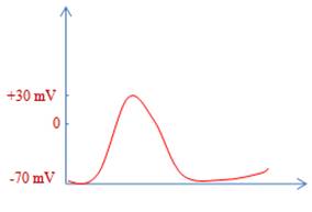 En apportant de stimulation sur la fibre nerveuse, on observe sur l’écran de l’oscillographe le passage brusque du potentiel membranaire de -70mV à +30mV : L’intérieur de la cellule est chargé positif et l’extérieur négatif. Ce changement (qui dure 1 millième de seconde) s’appelle potentiel d’action. Il correspond à une onde de négativité qui se propage à la surface de la fibre nerveuse.