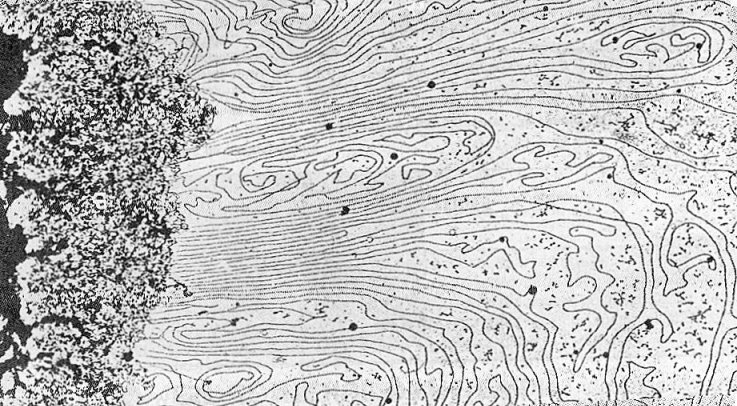 Vous retrouvez à gauche de la photographie le corps du chromosome "fantôme" et son contenu dans le reste du document (grossissement x 24000). Le contenu du chromosome apparaît comme un long filament. Ce long filament est un filament de chromatine. Cliquez sur le filament pour voir le détail de la chromatine. |