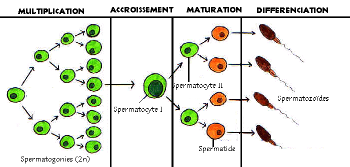 La spermatogenèse est en fait la formation des gamètes mâles, c'est à dire des spermatozoïdes. Les spermatozoïdes se forment dans les testicules, et plus précisément dans les tubes séminifères, passent par les canaux efférents et arrivent dans l'épididyme, rejoignent le canal déférent jusque dans la prostate. La formation se passe en quatre étapes.