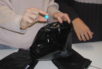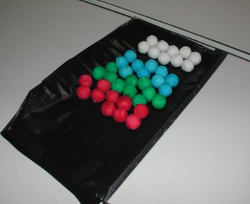 Des boules de cotillons ont été utilisées (les mêmes que pour les simulations de désintégrations des radio-isotopes). Les sacs sont confectionnés avec des sac-poubelles. Au départ de la manipulation les 40 boules sont enfermées dans un seul sac. |