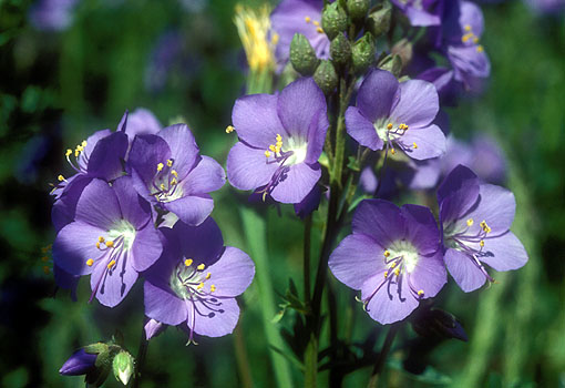Polémoine Polemonium caeruleum, Polemoniaceae, Polemoniales, Spermatophytes. Chez cette espèce, le caractère "couleur de la fleur" est représenté par deux allèles: bleu "B" est dominant et "b" blanc est récessif. Le génotype de la plante illustrée est donc soit "BB", soit "Bb". (Jardin alpin du col du Lautaret, Ecrins, France - 20/07/1990 - Diapositive originale réalisée par Eric Walravens).