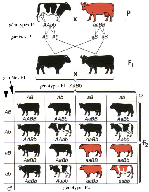 Un autre cas de dihybridisme est celui de la robe du bœuf domestique Bos taurus, dont l'aspect peut être uni ou tacheté (="pie") et la couleur noire ou rousse: si l'on croise un taureau pie noir de lignée pure avec une vache à la robe unie et rousse de lignée pure, les veaux produits sont tous unis et noirs. On en déduit que l'allèle "robe unie" est dominant par rapport à l'allèle "pie", et que, d'autre part, l'allèle "noir" domine l'allèle "roux" récessif. Si ces enfants sont croisés entre eux, il apparaît en seconde génération 9/16 de bœufs unis et noirs, 3/16 de bœufs pies noirs, 3/16 de bœufs unis et roux et 1/16 de boeufs pies roux, cette dernière combinaison phénotypique apparaissant pour la première fois.