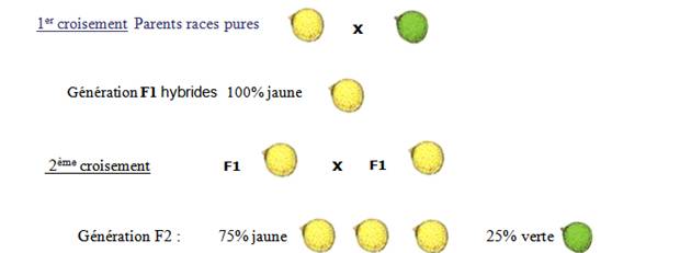 Mendel réalise une hybridation ou croisement entre pois ayant deux "traits" différents pour un même caractère : couleur des graines: jaune et verte