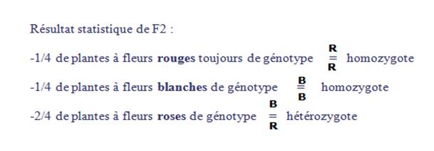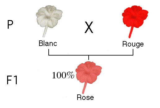 Si l'on croise deux de ces fleurs roses F1, à la seconde génération "F2", on obtiendra des plantes à fleurs rouges, d'autres à fleurs blanches et d'autres à fleurs roses.