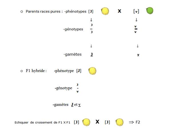 -La première loi de Mendel, ou loi d'association ou loi de l’uniformité de F1, dit que "les hybrides issus du croisement de parents de lignée pure différant par un caractère sont uniformes et associent les caractères parentaux", ici les couleurs jaune et verte ; dans notre exemple F1 100% jaune