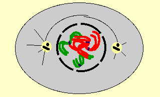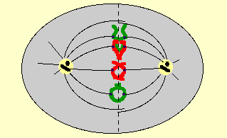 Les deux asters sont aux deux pôles opposés. Les microtubules émis par chacun d'eux les maintiennent en place et constituent le fuseau (des microtubules de même type existent évidemment dans les autres plans de l'espace).