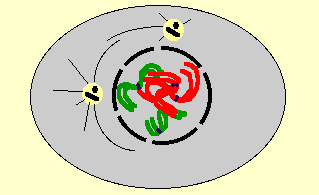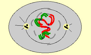 Les chromosomes s'individualisent (les couleurs rouge et vert symbolisent l'origine paternelle ou maternelle des chromosomes). Le centrosome a été dupliqué en fin d'interphase.