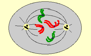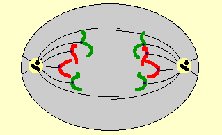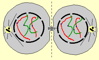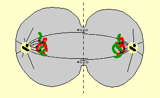 Les deux lots de chromosomes sont rassemblés aux pôles car ils sont guidés par la cage formée par le fuseau lui-même. Un cercle de fibres contractiles (acto-myosine) apparait autour de la cellule dans le plan de l'équateur.